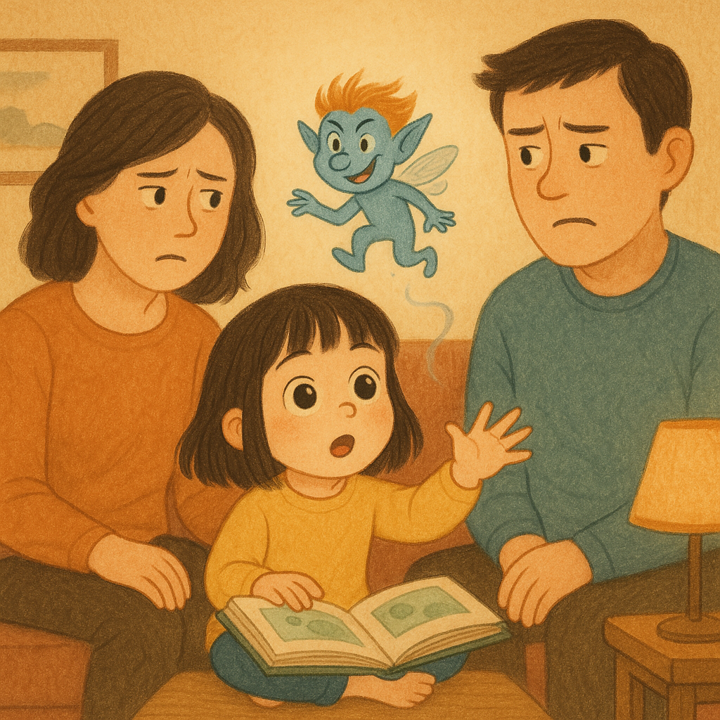 "우리 집에도 요정이 있었던 적이 있을까?"라고 자연스럽게 물어보면, 아이의 기억 속 감정들이 말로 나올 수 있을 것 같습니다.