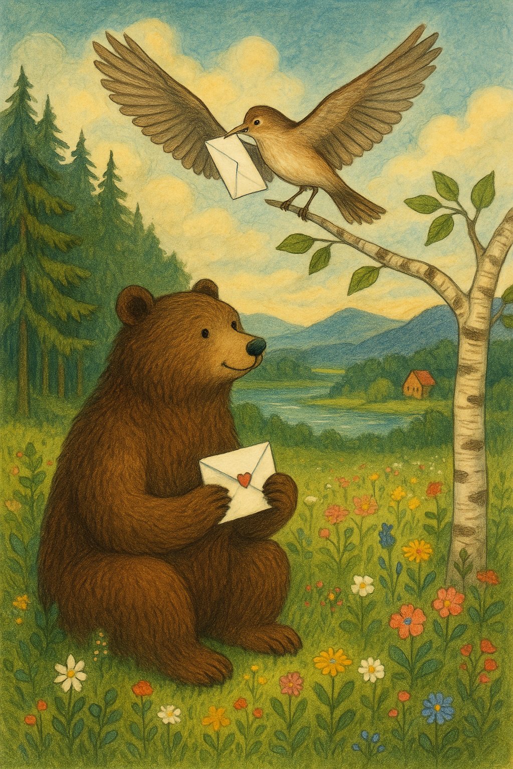 편지를 쓰면서 곰은 사막을 건너고 바다를 가로지르며 세상 끝에 있는 친구에게 가고있습니다.