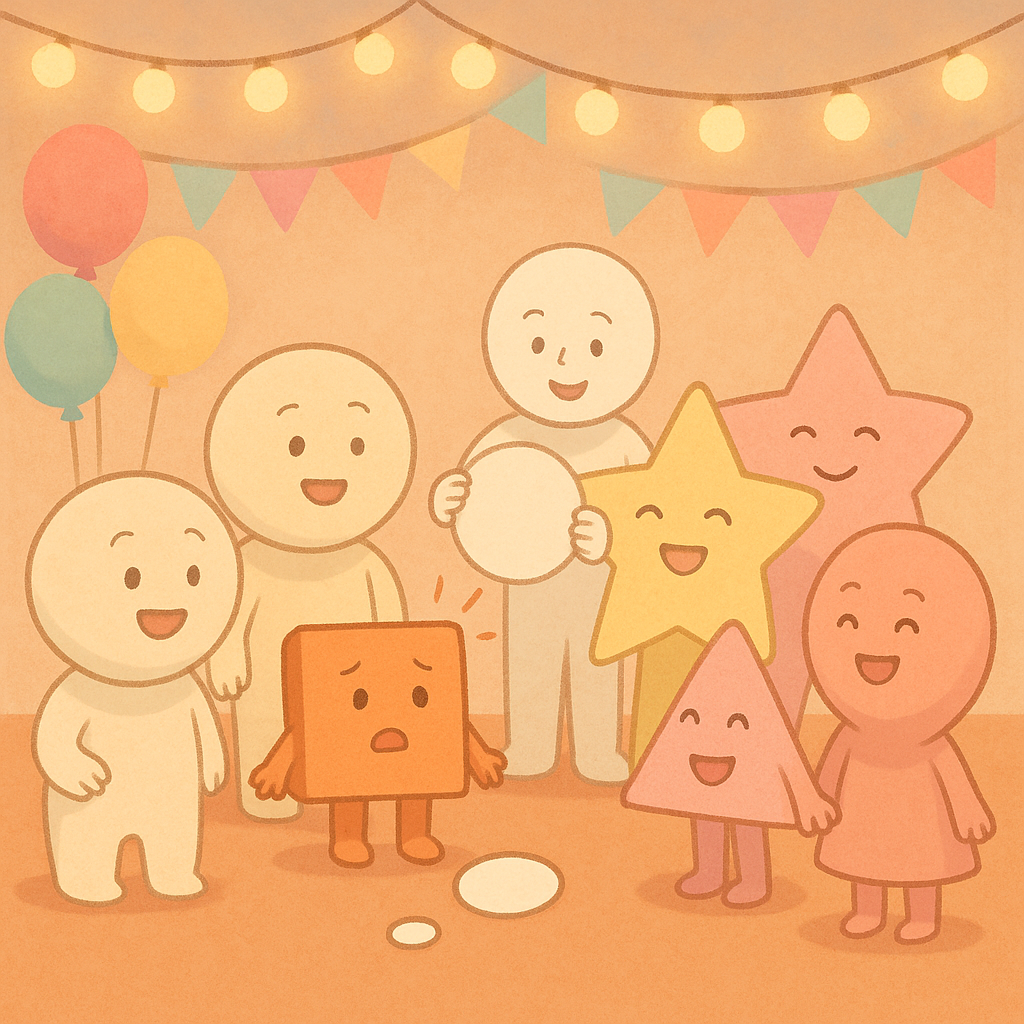 어느 날 친구들과 함께 파티에서 즐겁게 놀던 중, 네모의 몸에서 동그라미 모양이 떨어져 버렸습니다.